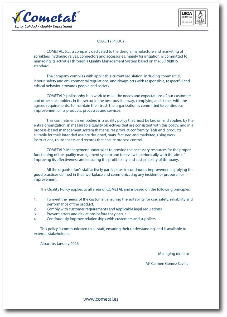 The Cometal Management system has the ISO 9001: 2015 Quality Certificate.